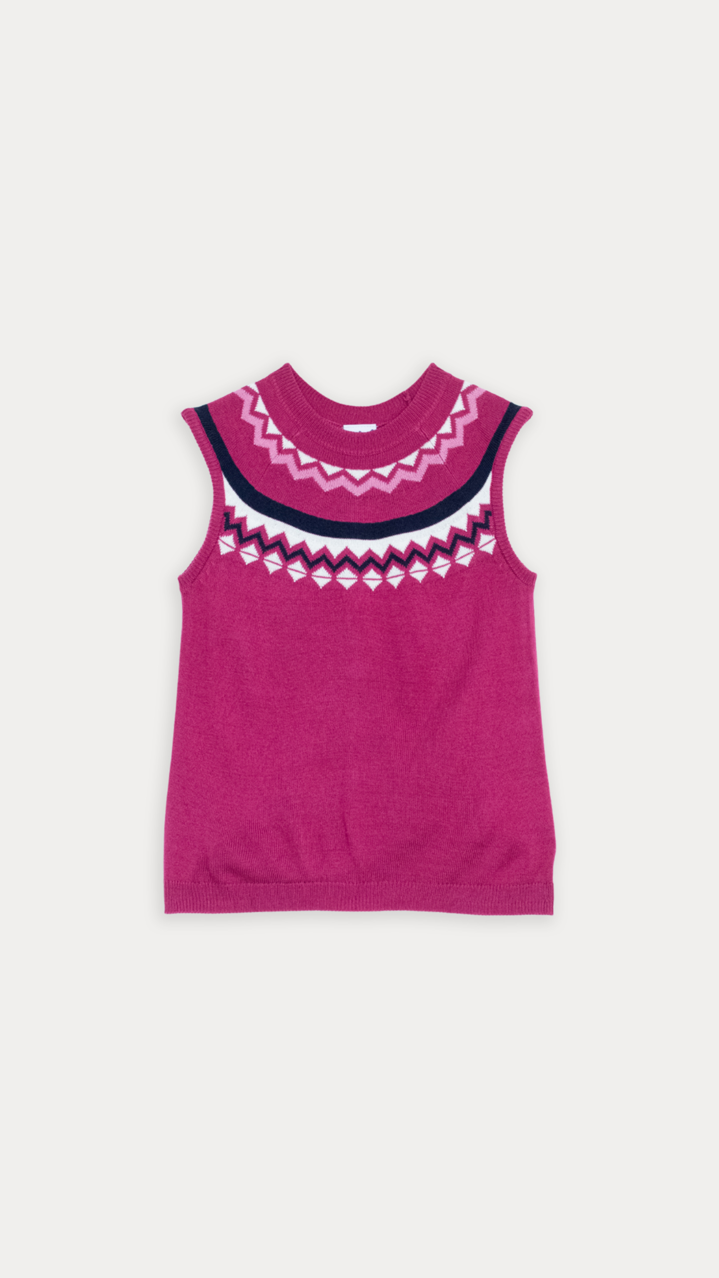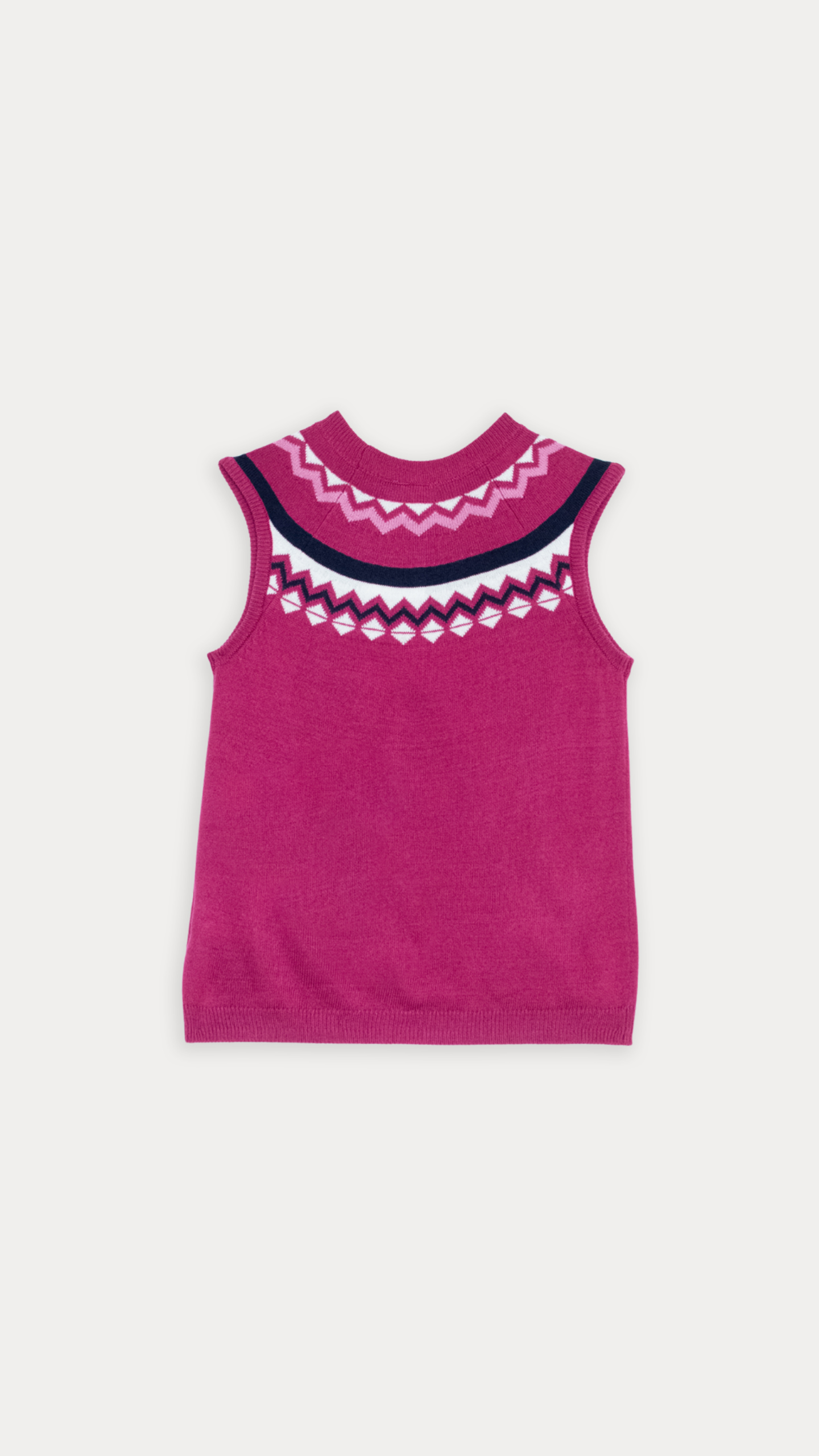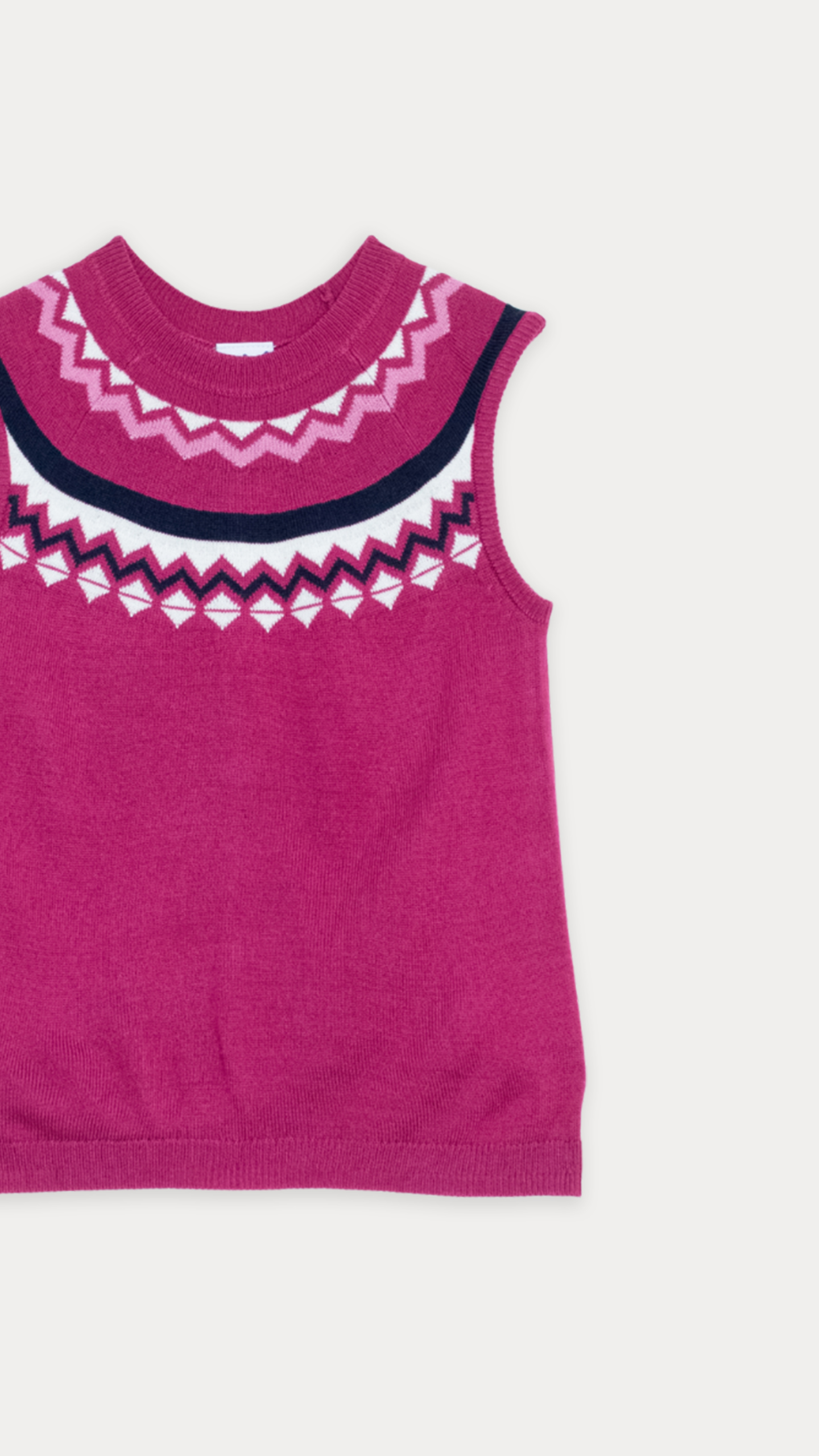 CHALECO DE ALGODÓN TEJIDO FUSCSIA CON DETALLES AZUL MARINO Y BLANCO PARA NIÑA