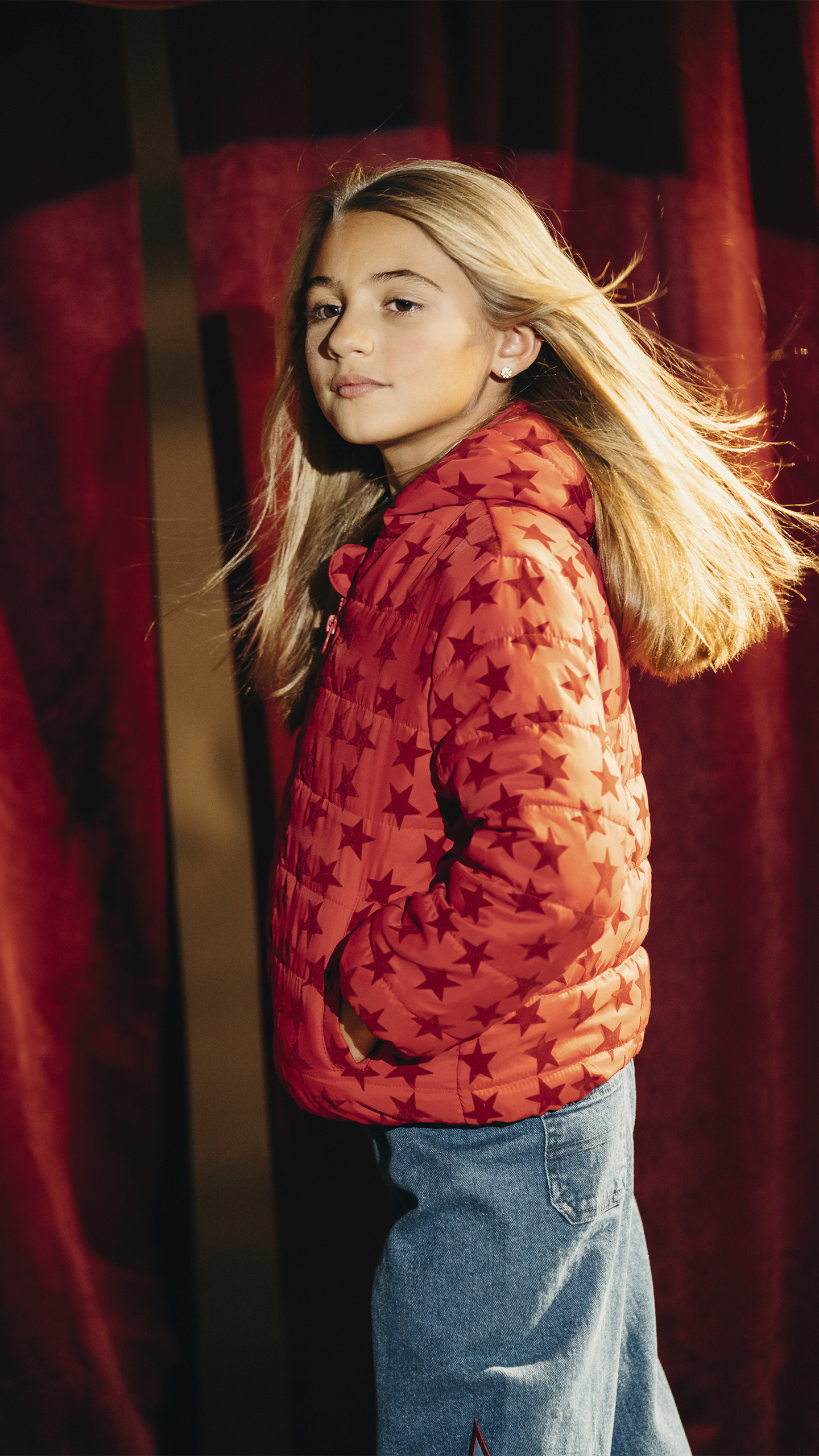 CHAQUETA ACOLCHADA ROJA CON ESTRELLAS DE TERCIOPELO VINOTINTO PARA NIÑA