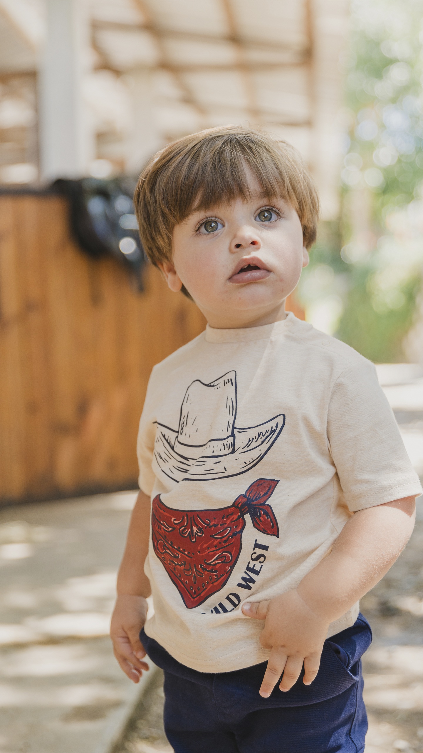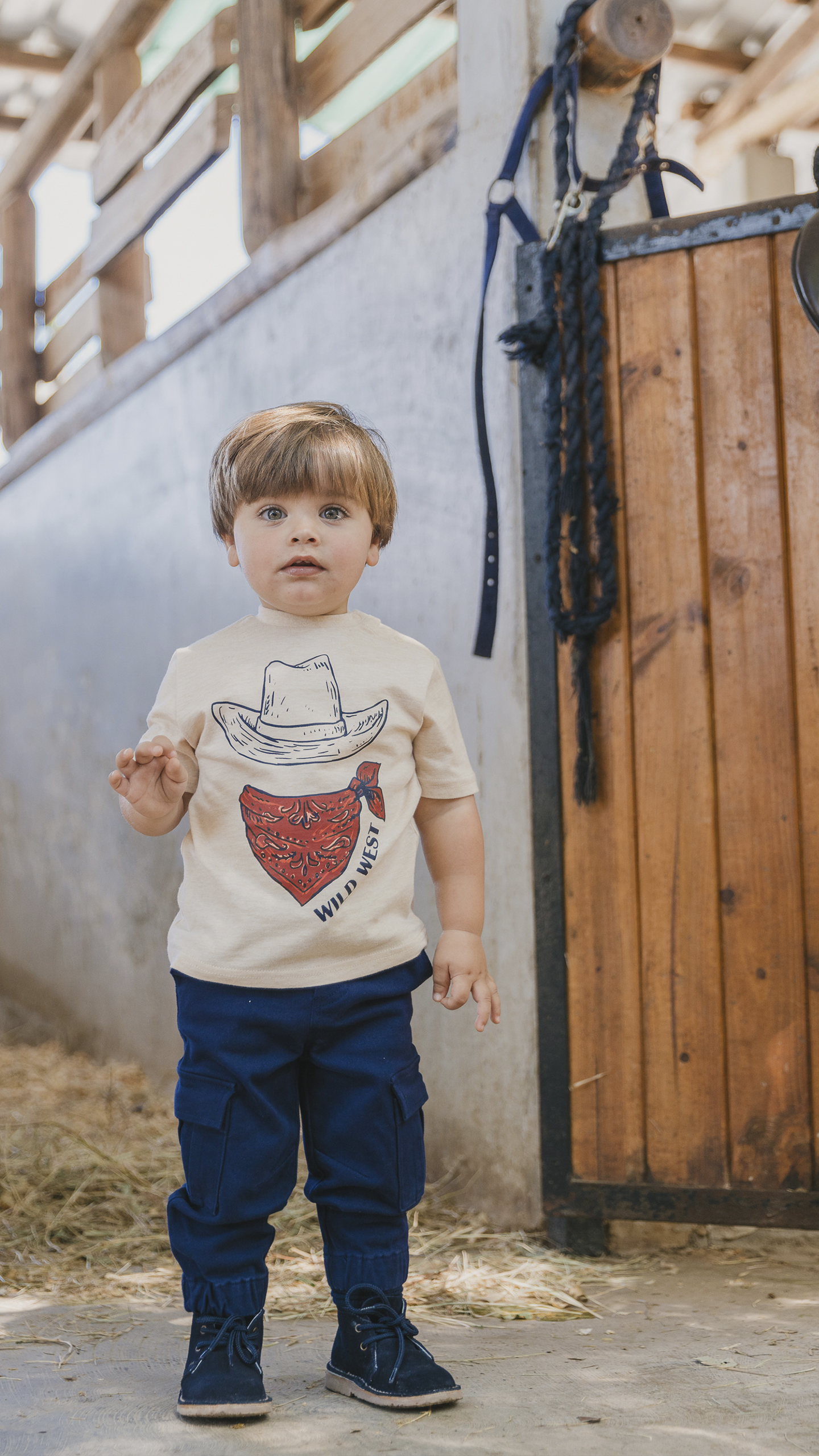 FRANELA DE ALGODÓN AMARILLO CLARO CON GRÁFICO DE VAQUERO PARA BEBE NIÑO
