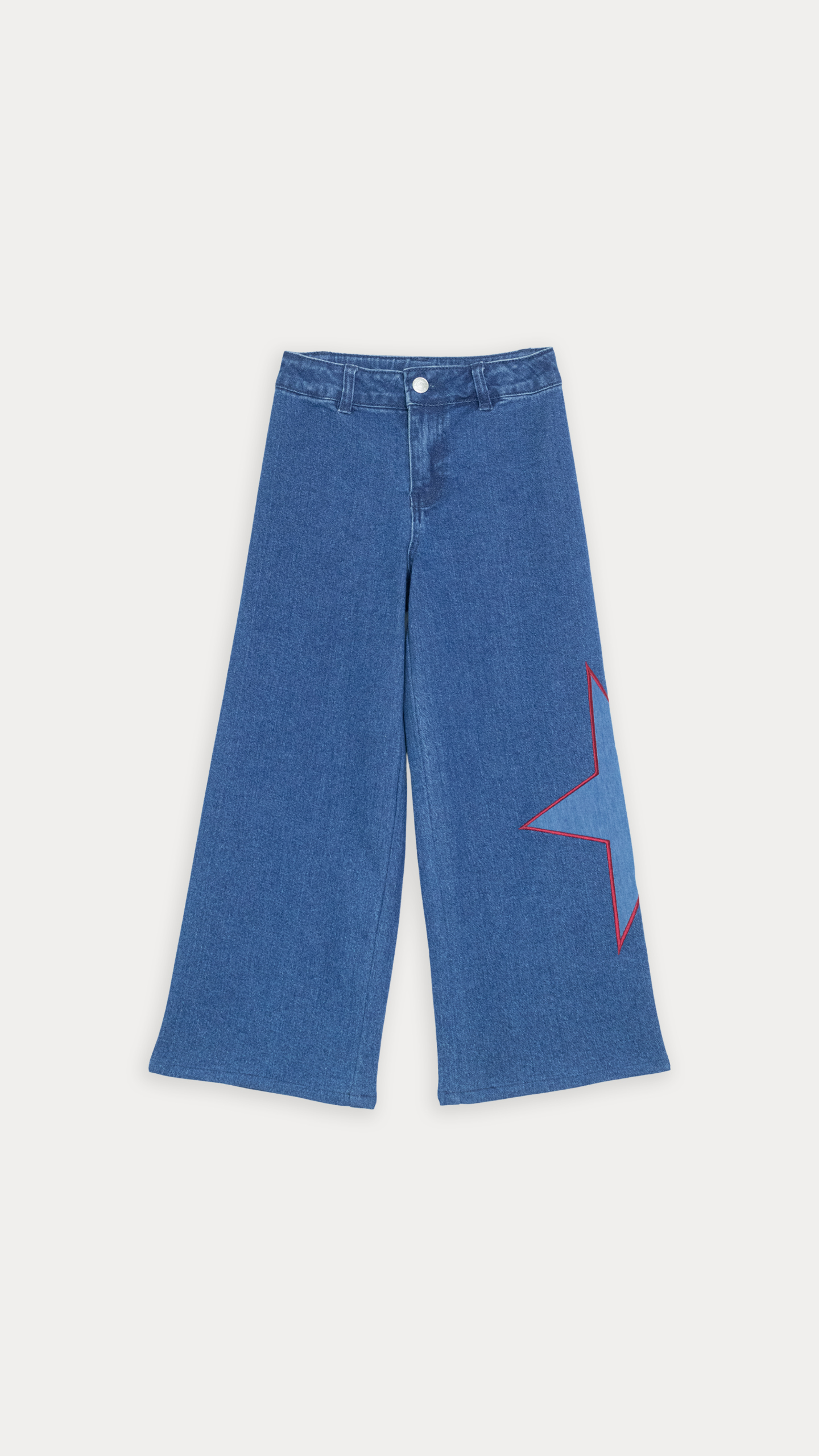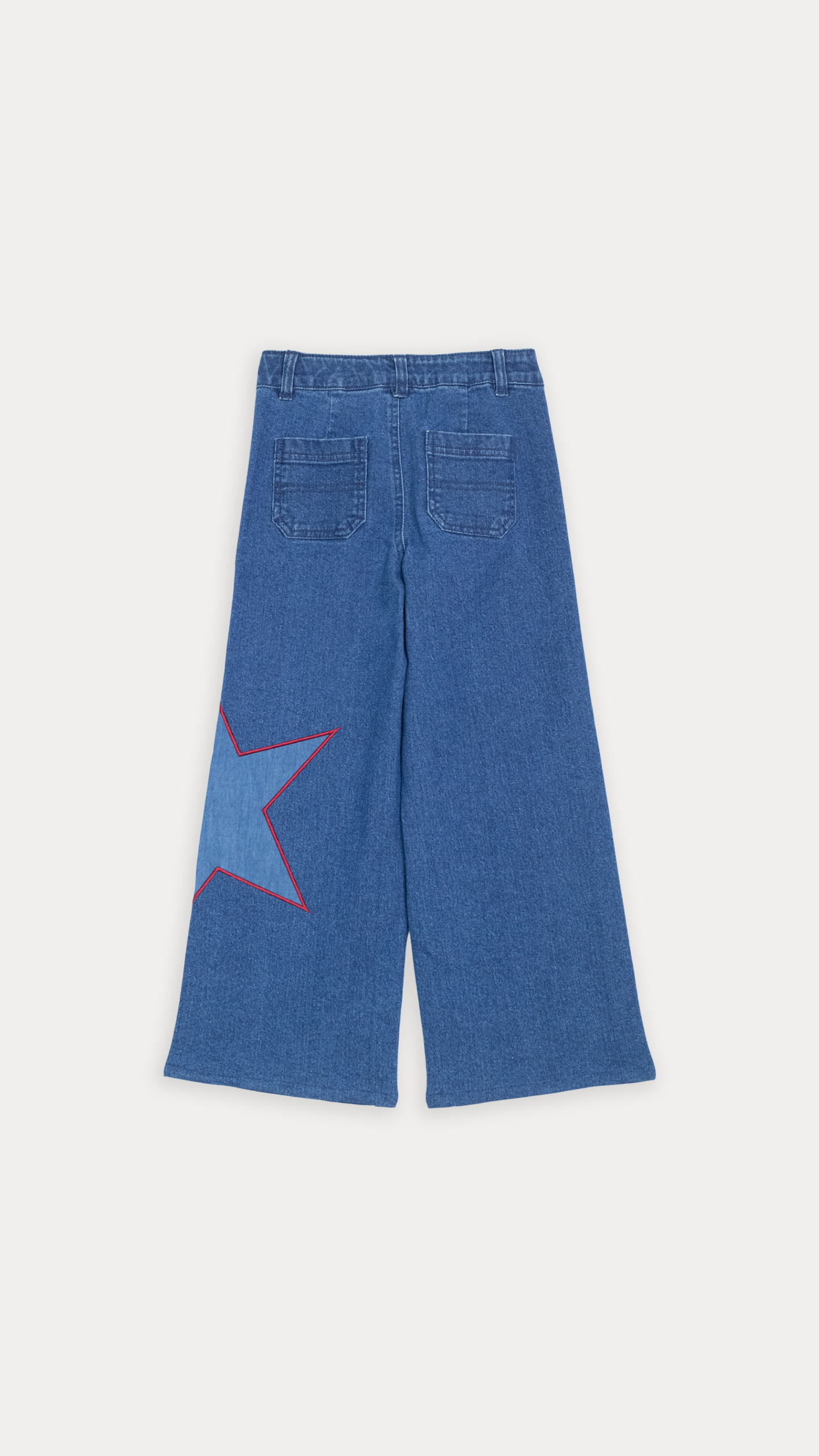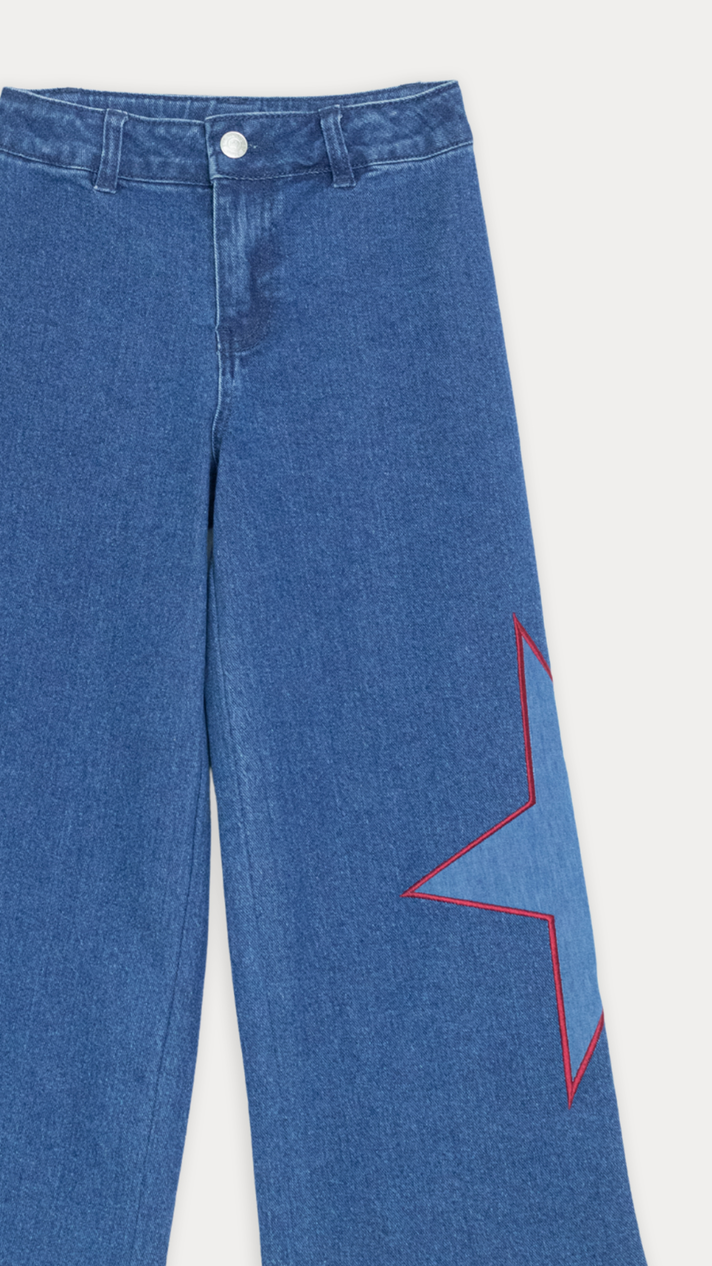 JEAN AZUL OSCURO CON PARCHE DE ESTRELLA EN AZUL CLARO Y DETALLE EN VINOTINTO PARA NIÑA