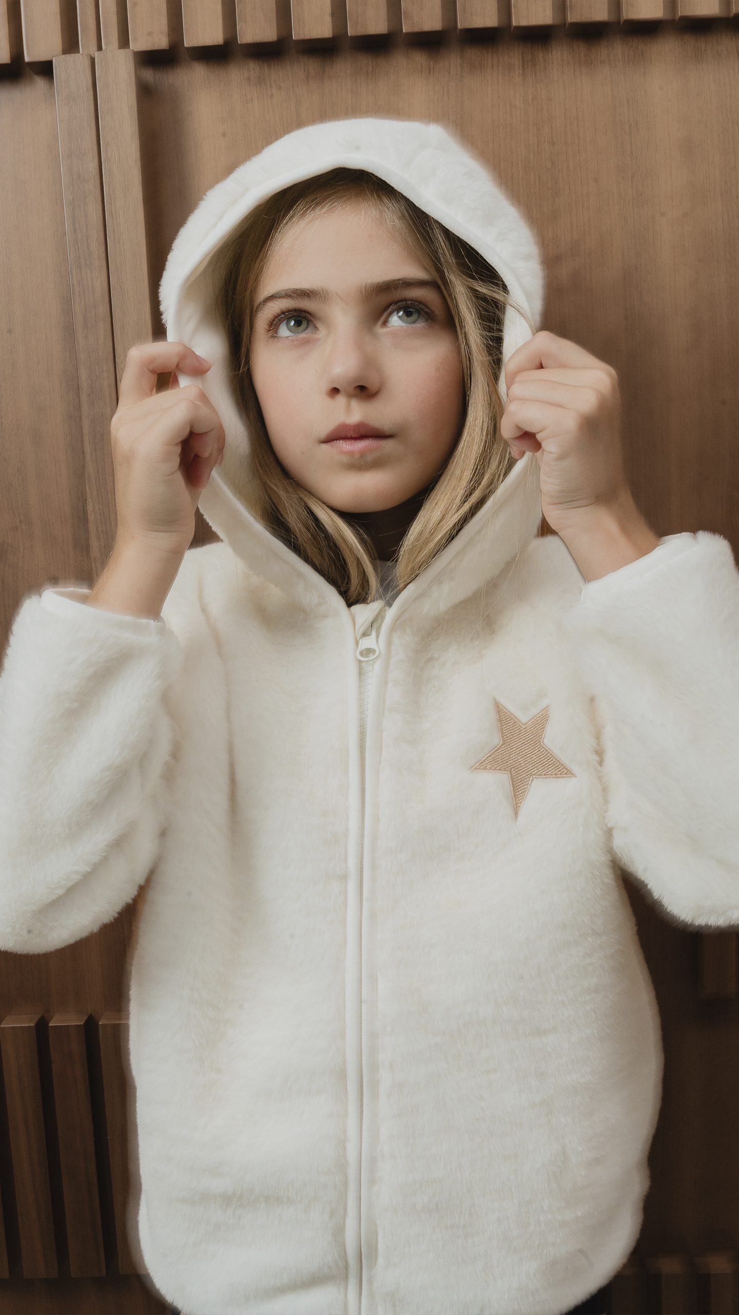 SUÉTER DE FELPA CREMA CON BORDADO DE ESTRELLA DORADO METÁLICO Y CIERRE PARA NIÑA