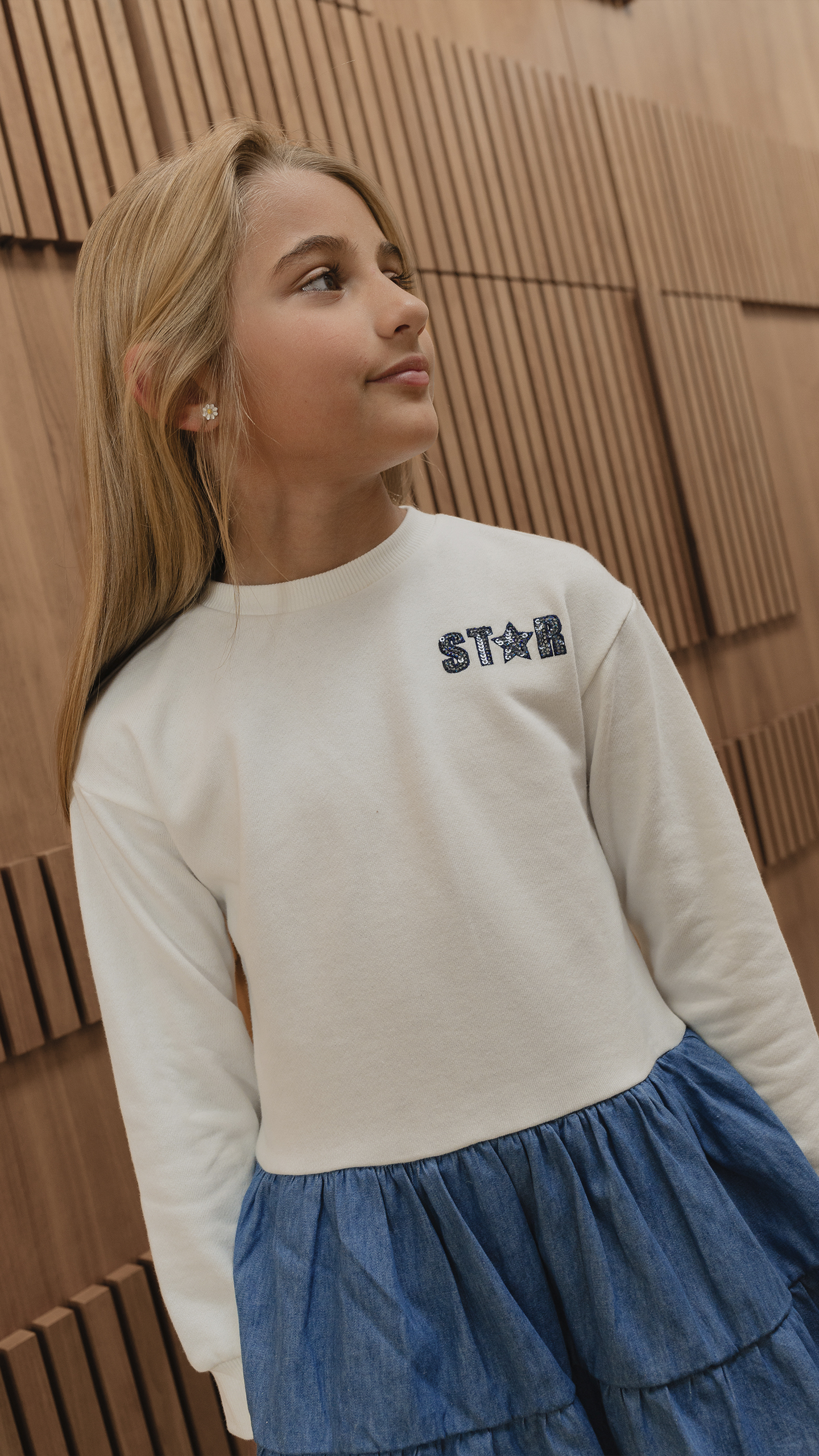 VESTIDO DE ALGODÓN CREMA MANGA LARGA CON FALDA DE CHAMBRAY AZUL OSCURO Y BORDADO DE LENTEJUELAS PARA NIÑA