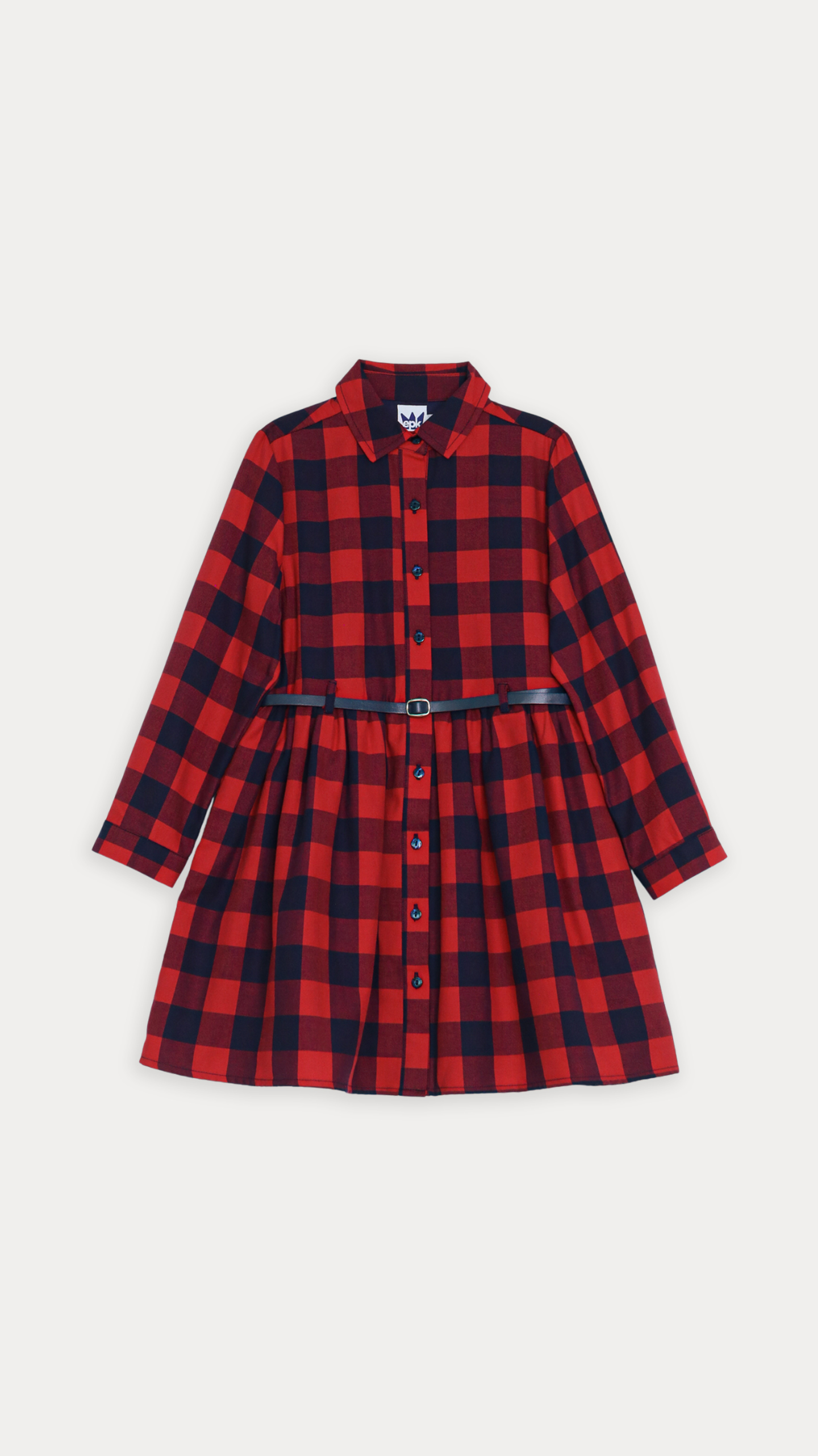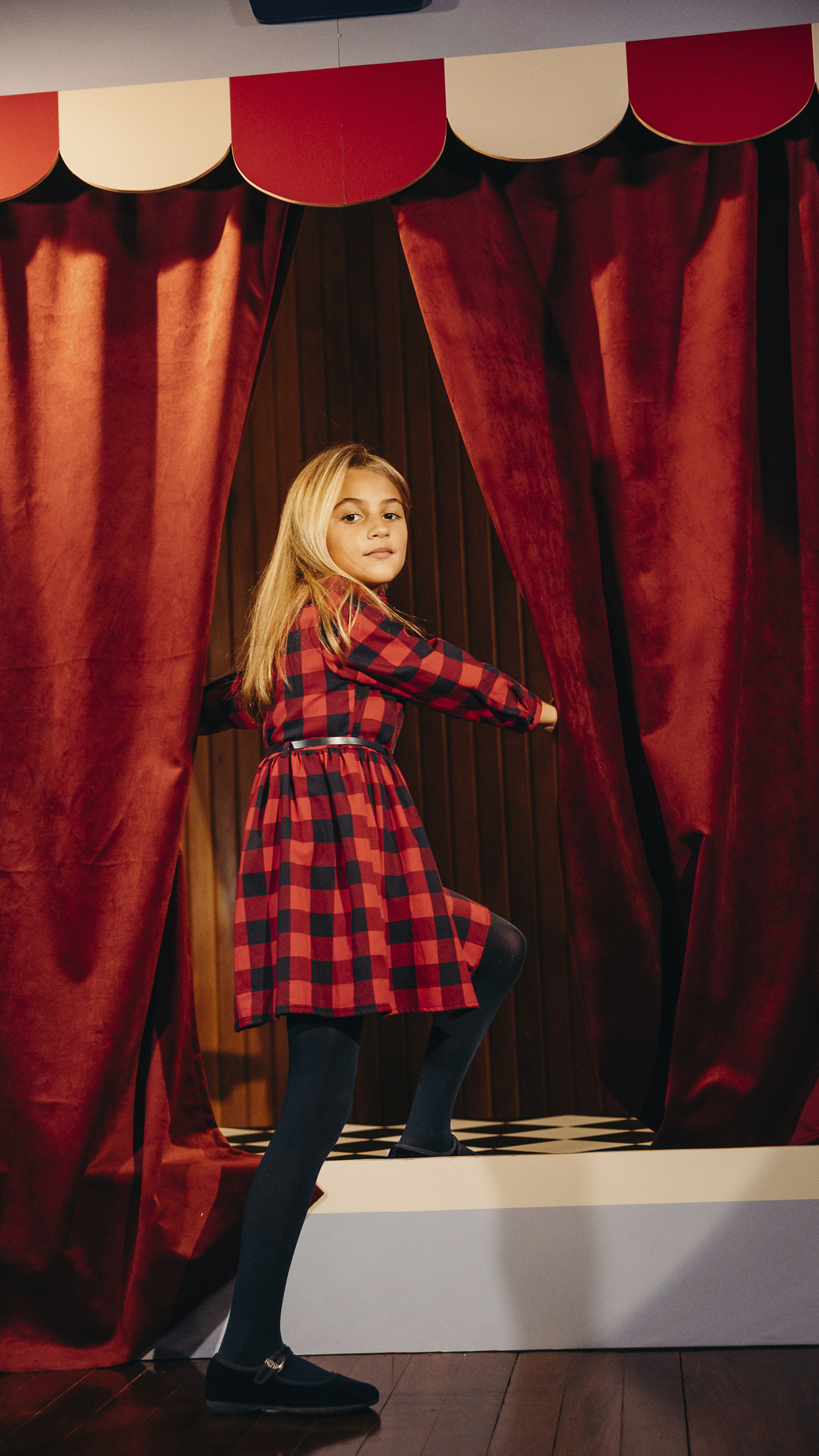 VESTIDO DE FLANNEL TWILL CON ESTAMPADO DE CUADROS VINOTINTO Y AZUL MARINO PARA NIÑA