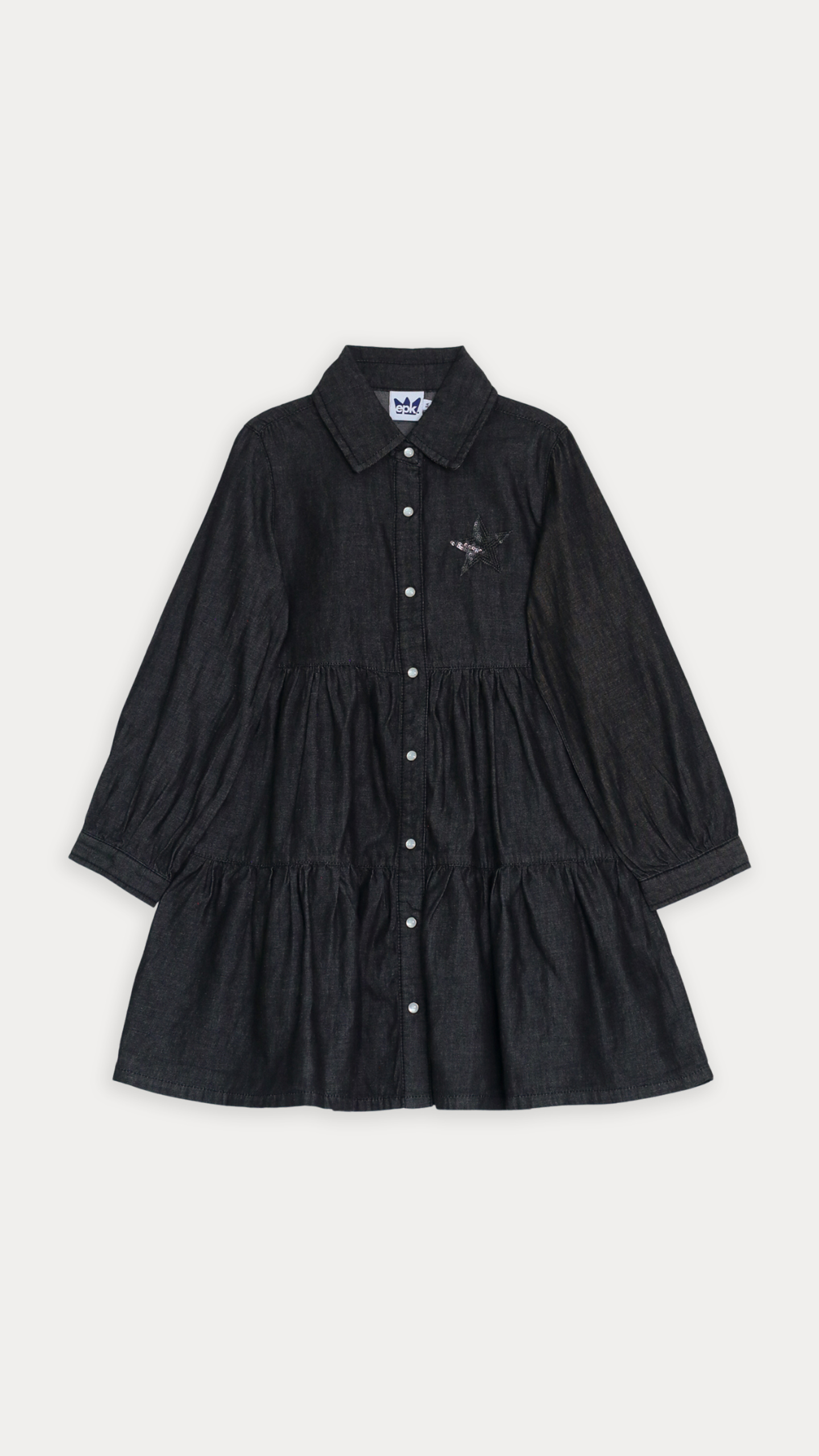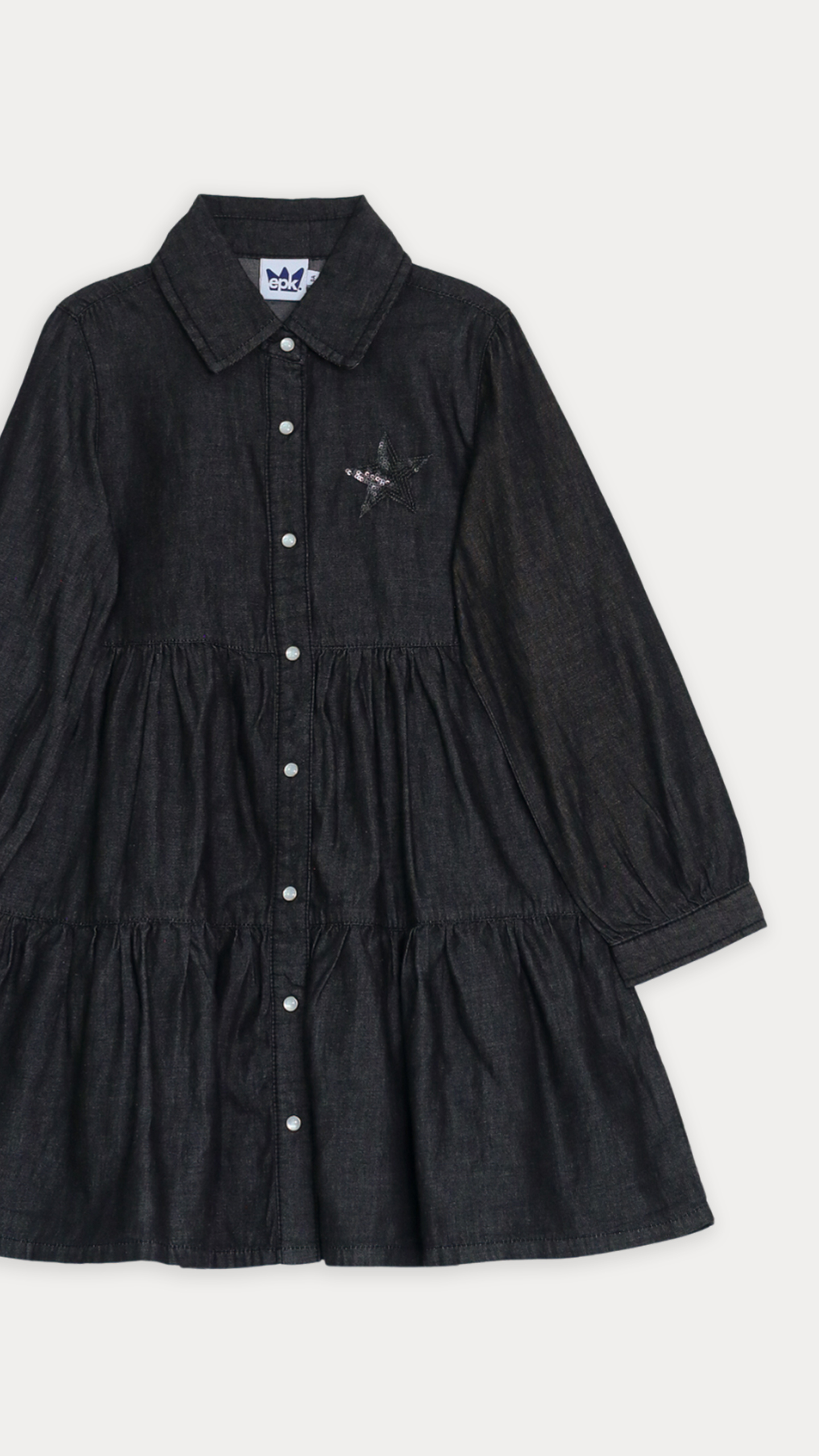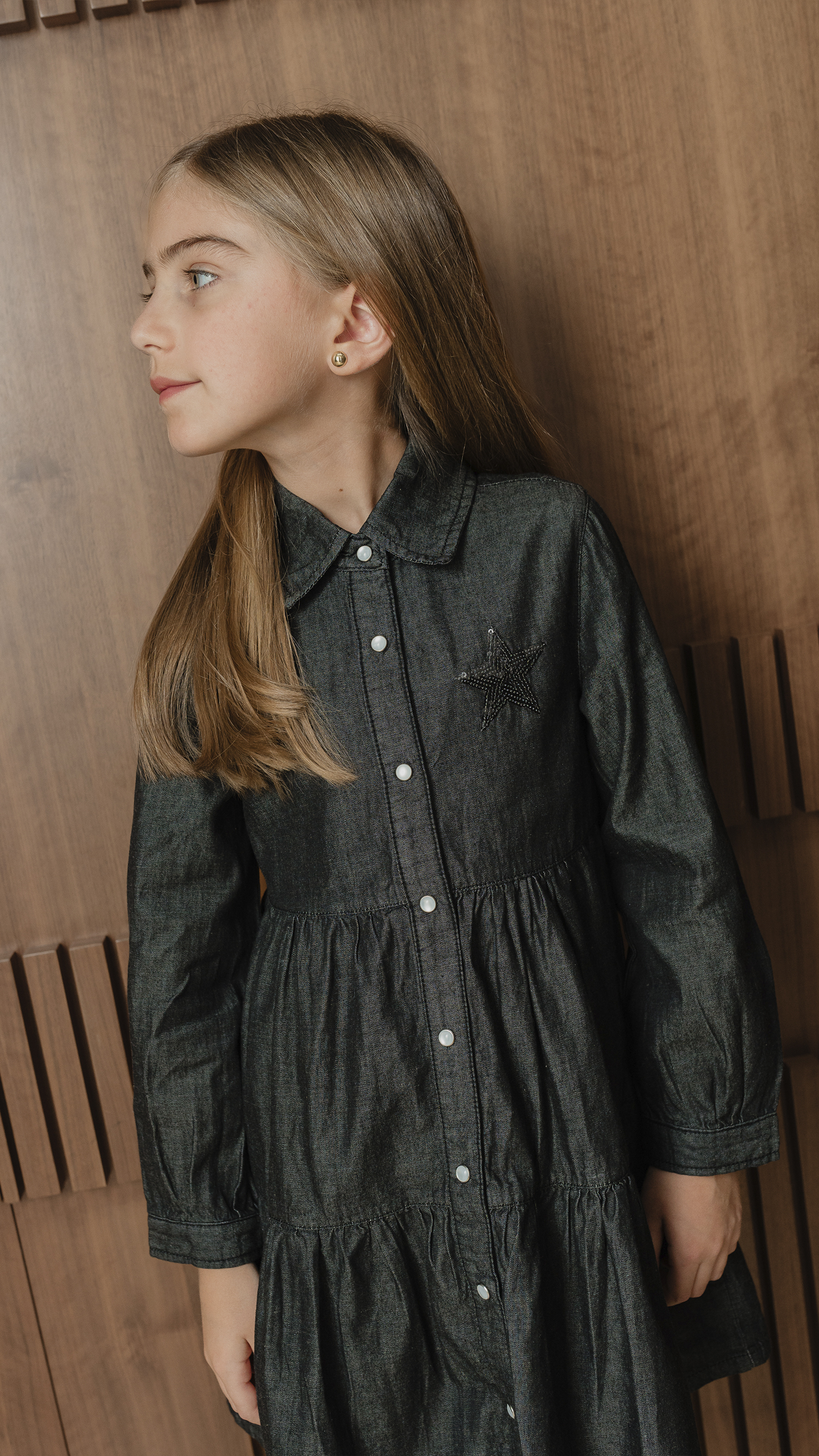 VESTIDO DE CHAMBRAY NEGRO CON PARCHE DE ESTRELLA DE LENTEJUELAS PARA NIÑA